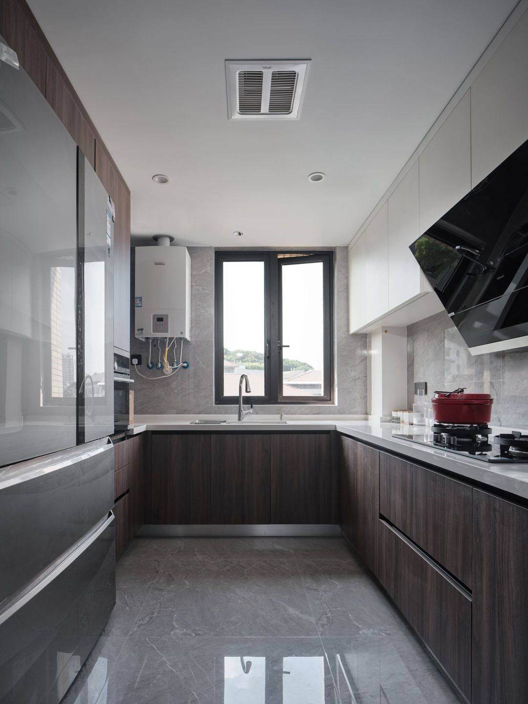 厨房u字形台面设计,最大可能的满足操作台面。电器高柜内嵌冰箱,白色吊柜使用闭门器,深木色橱柜使用隐形拉手,使得整个空间干净整洁。