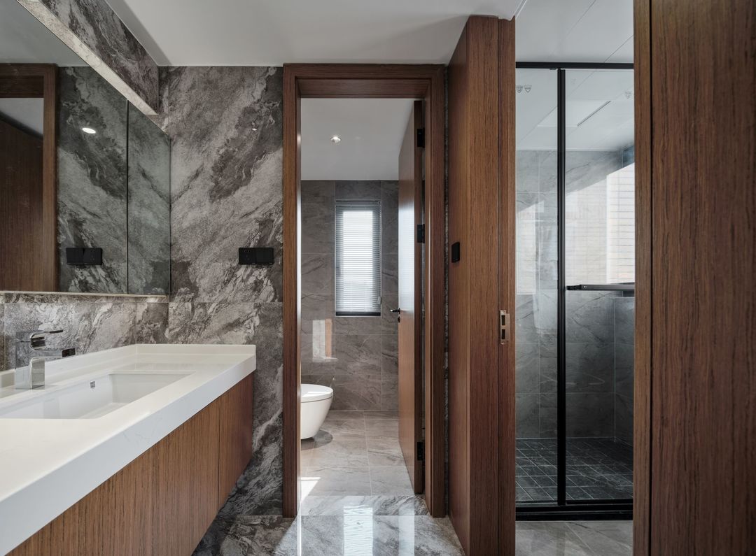 卫生间的三分离实现了安全性强,减少因水花四溅地面积水而滑倒的可能性,提高卫生间实用效率,便于多人同时使用,而且能够隔绝气味和湿气,还可以延长设备使用寿命。简约的卫生间干区,壁挂马桶等处处都呈现出对生活细节的推敲。
