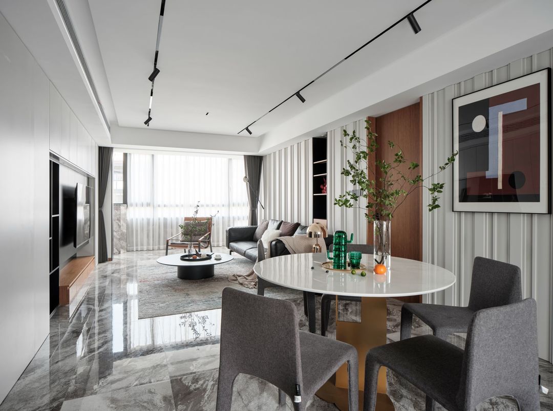 灰色的餐椅简约且舒适,餐厅作为整个房屋的中心点,设计圆形餐桌,方便周围动线,节约空间。