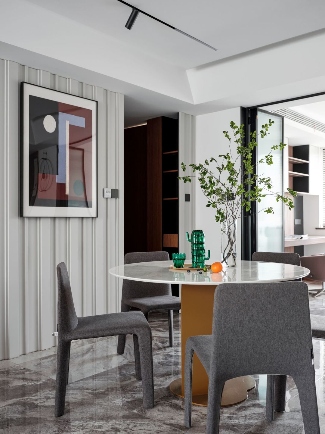 客餐厅一体,餐厅背景墙设计几何艺术挂画,有些画看起来不好看,但是一上墙就非常的合适。