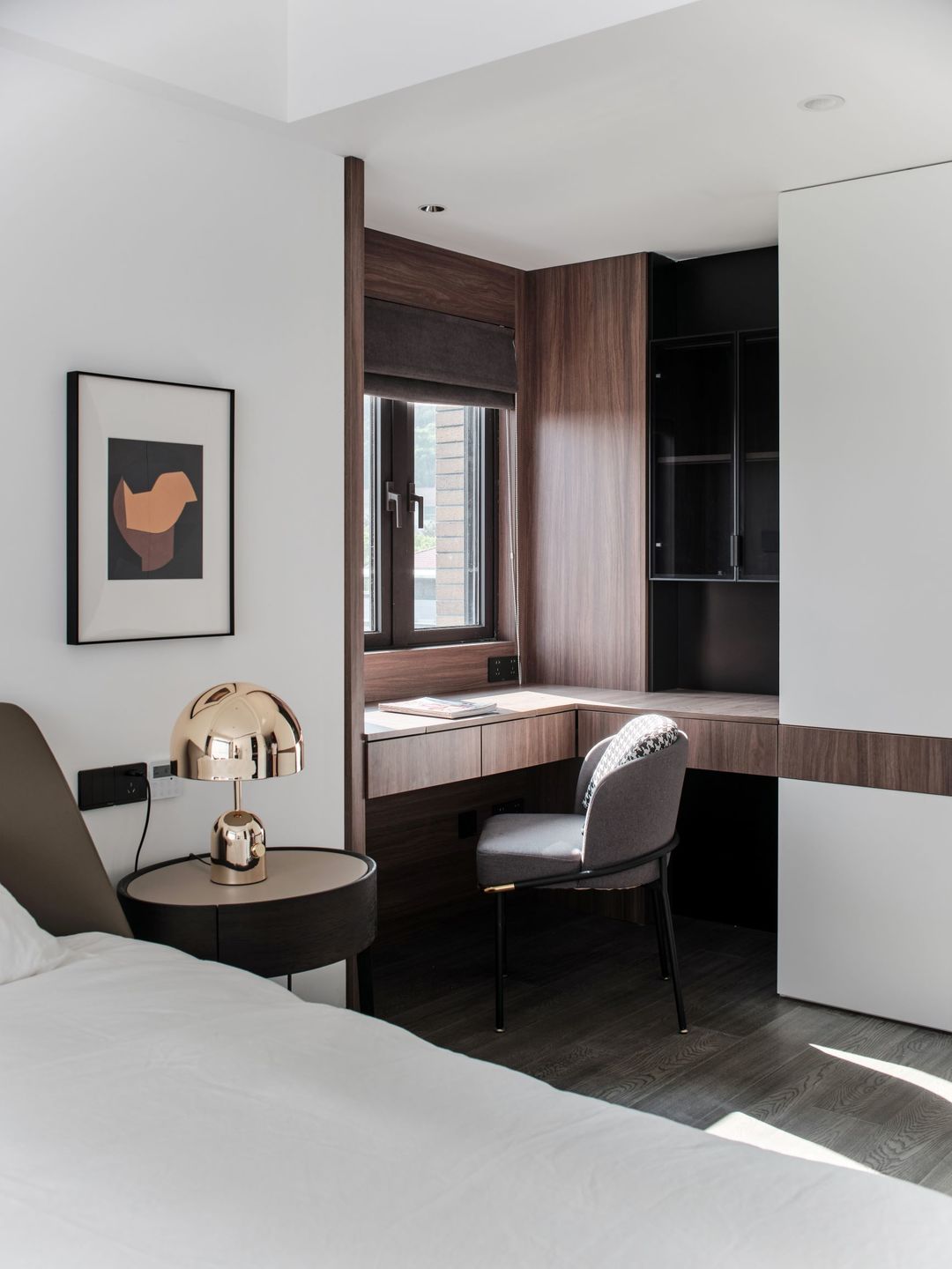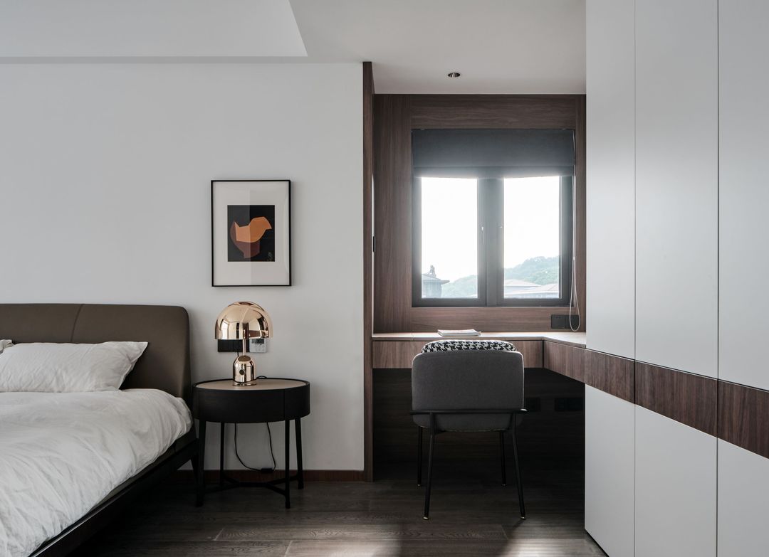 靠窗坐梳妆台,木饰面包墙,定制转角台面。椭圆形的床头柜充满了设计感,深色皮质床搭配玫瑰金的台灯质感满分。