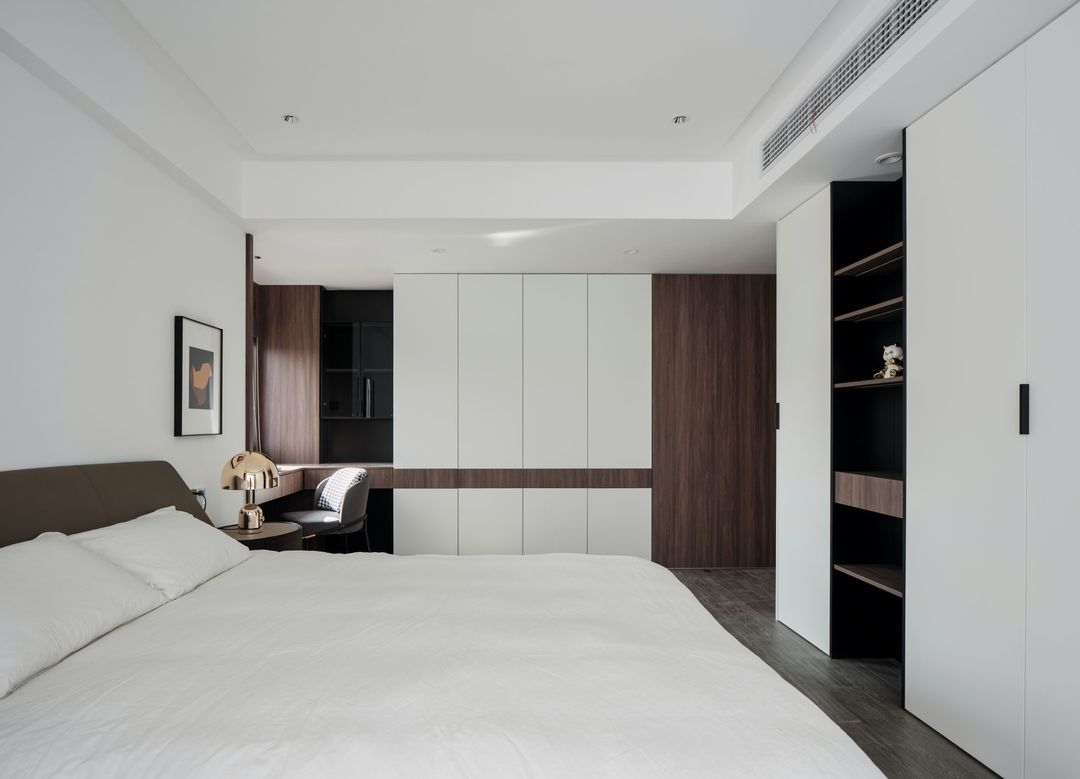 主卧两面整墙衣柜设计,储物功能非常强大用白色木色与黑色的巧妙搭配,让衣柜充满了连续性,梳妆台延伸至衣柜。
