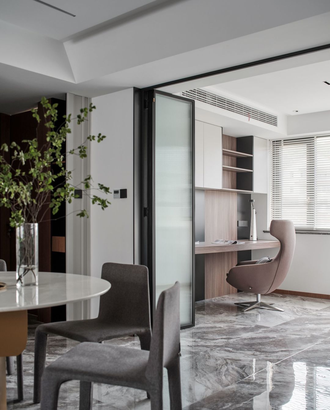 位于客餐厅旁边的书房,是半开放式的。地面延伸客餐厅地砖,木色踢脚线提高墙面温度值,黑色开放格和白色储物柜虚实结合。