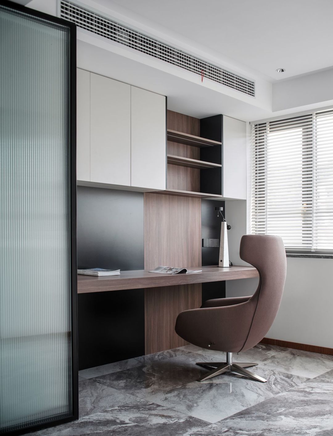 成品皮质办公椅,舒适具有品质感。书房墙面木色与黑色结合,与木色书桌纵横交错,白色柜体闭门器设计。