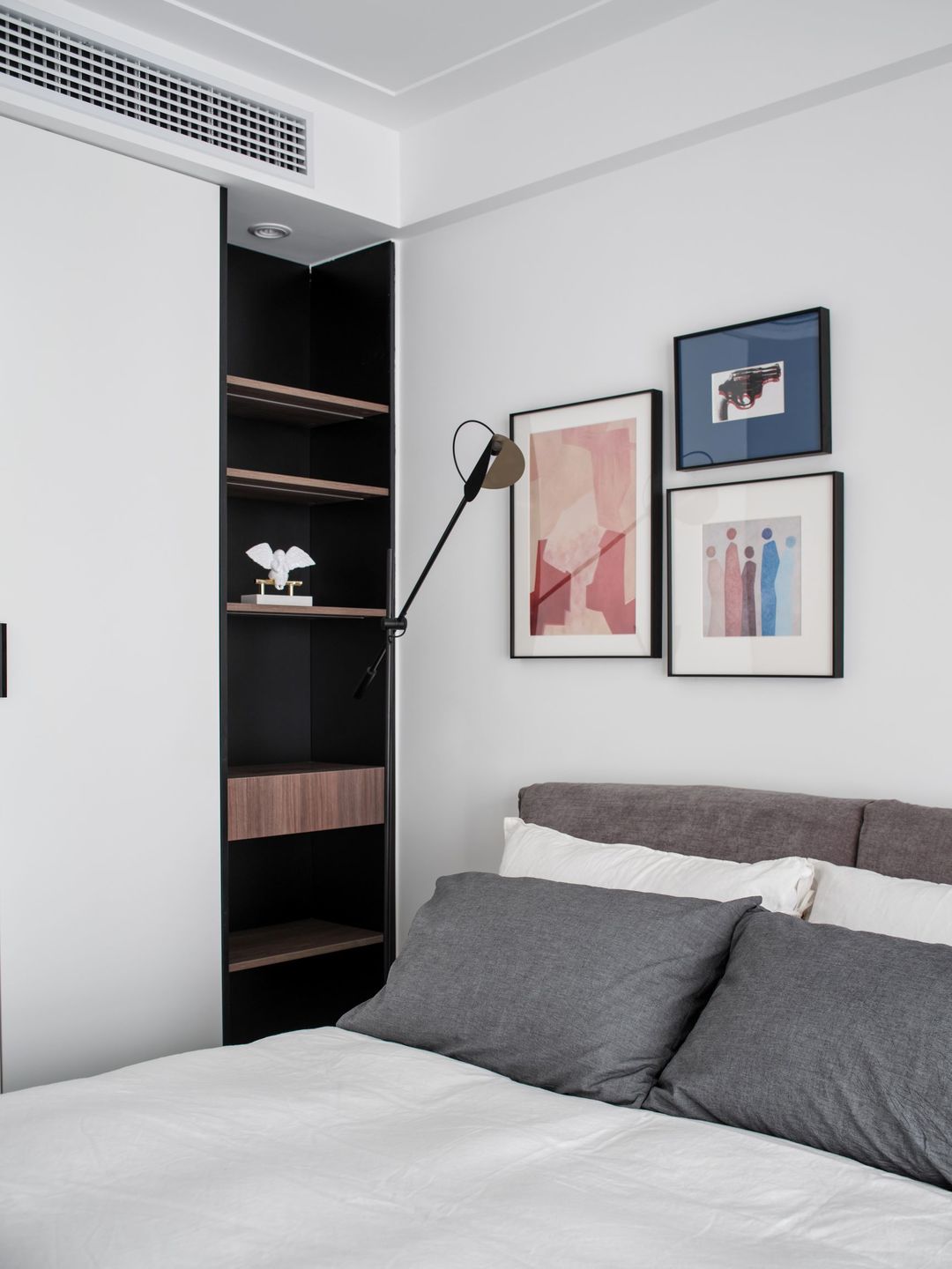 白色背景墙上挂不规则艺术画,让整个空间活跃起来。